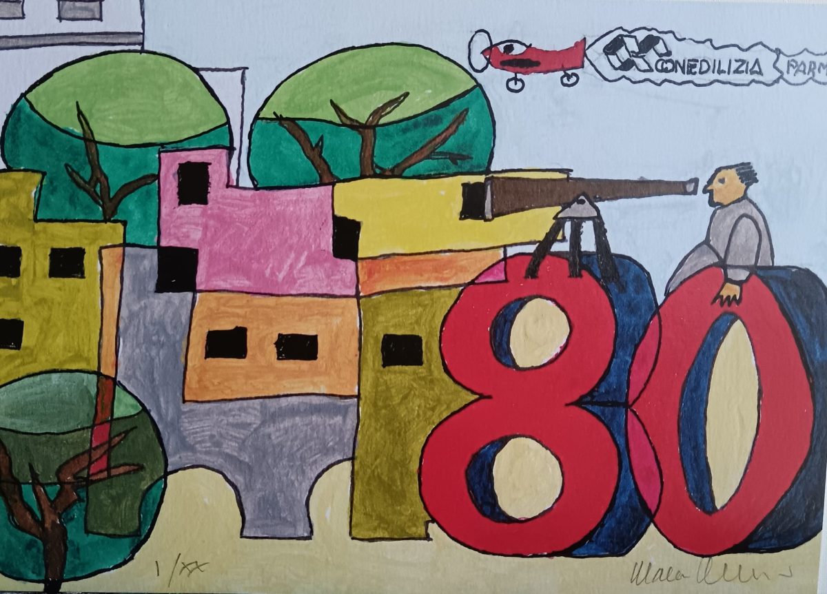 Ho avuto incarico dall'Associazione Proprietà Edilizia di Parma in occasione del suo Congresso per l'80° anno di realizzare una serigrafia che ricordasse l'avvenimento in 100 esemplari numerati e firmati, 16x23 cm, da distribuire ai partecipanti al Congresso svoltosi a Parma all'Hotel de la ville il 24/10/25. L'originale è stato donato ed è esposto all'Associazione Proprietà Edilizia di Parma.